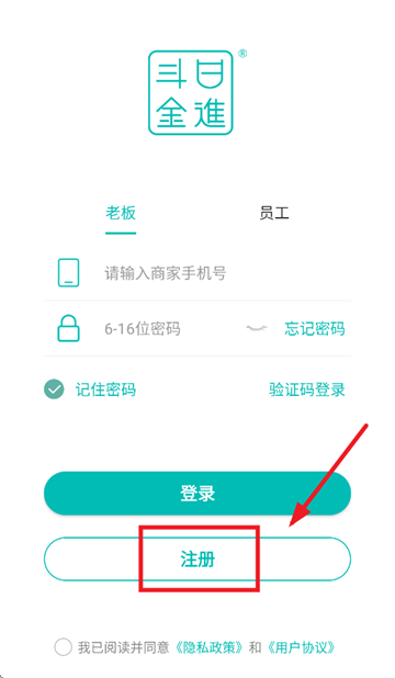 安装并启动日进斗金服装软件,待进入登录页面后,点击注册按钮。