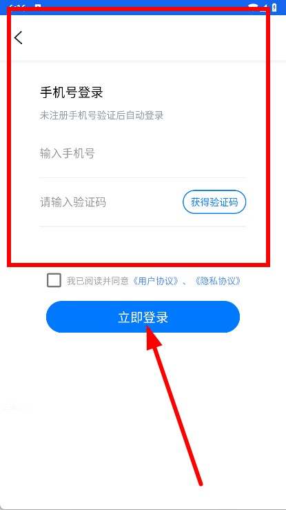 4、输入手机号码,勾选同意相关协议后,点击立即登录按钮,即可完成登录操作。