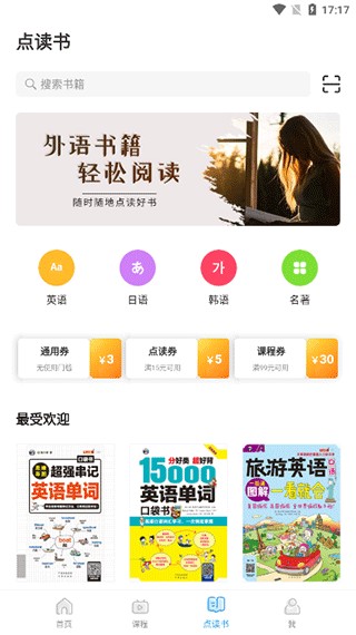 1首页界面集成了多种实用功能,包括点读学习、热门课程浏览、免费音频收听、有声读物播放、单词背诵以及词汇查询等。