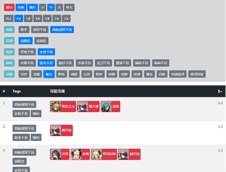4、点击推荐表格中的干员或标签即可进行精准查询,若需返回,点击任意干员或标签即可。