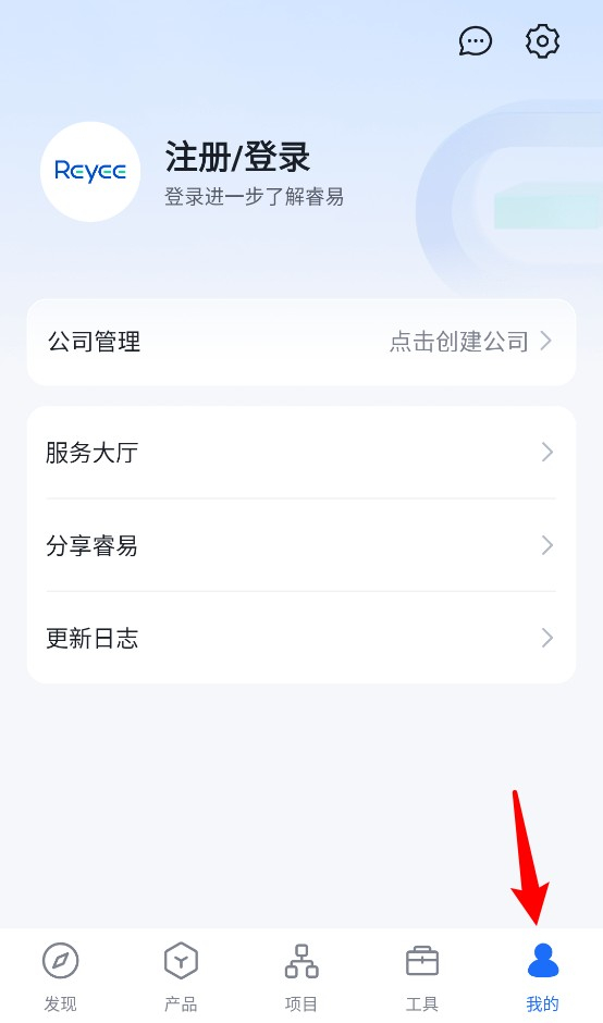 5、「我的」页面具备注册登录、公司管理、更新日志查看以及服务大厅访问等个性化功能。