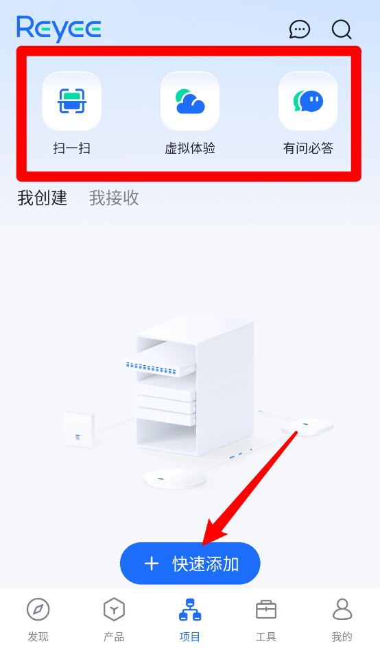 3、点击「项目」选项,能够借助“快速添加”功能来新增项目,此外还提供扫一扫、虚拟体验以及有问必答等功能的入口。