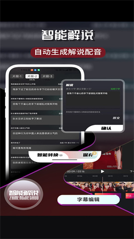 3、借助智能短剧解说功能,系统能依据对话内容自动生成解说文案,你还可以用自己的声音录制解说,让其成为视频的组成部分。