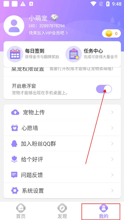 点击“我的”——打开悬浮窗按钮即可开启悬浮窗