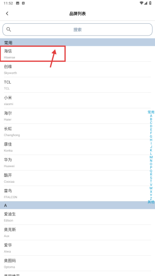 4、进入品牌列表页面后,找到并点击海信品牌对应的条目,即可完成海信电视遥控器的添加步骤。