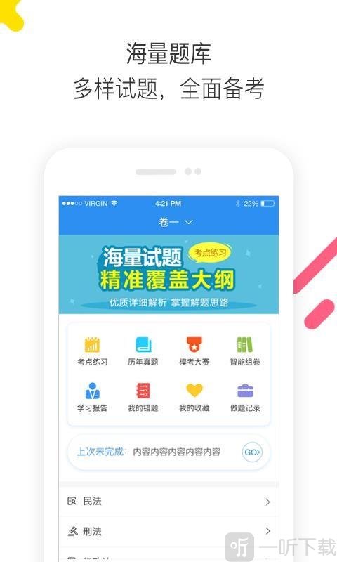 法考题库通这款应用软件,非常适合想要学习法律相关知识的人群以及律师朋友们使用。这里有丰富多样的习题和测试题,能帮助大家更好地发现自身在知识上的薄弱点。发现短板后,就可以针对性地进行补充学习,从而快速提升自己的法律知识水平。感兴趣的话,快来下载这款软件吧!
