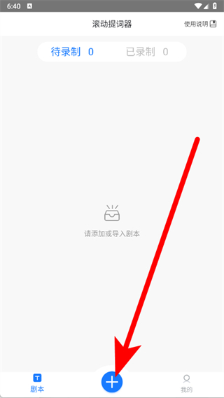 1、启动滚动提词器应用,找到页面底部正中间位置的蓝色加号按钮并点击。