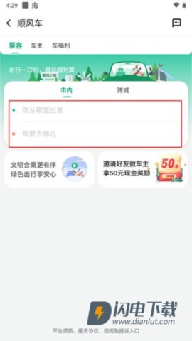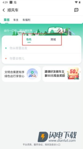 2、选择出发地与目的地,挑选市内或跨城顺风车。