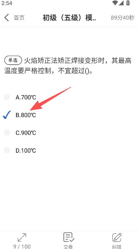 2进入考试页面后,完成单选题的作答(例如关于火焰矫正温度的题目),并选定对应的选项。
