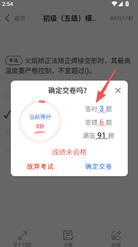 3完成所有题目作答后提交试卷,即可查看本次测试的即时得分情况,以及答对、答错和未答的题目数量等详细的成绩统计信息。