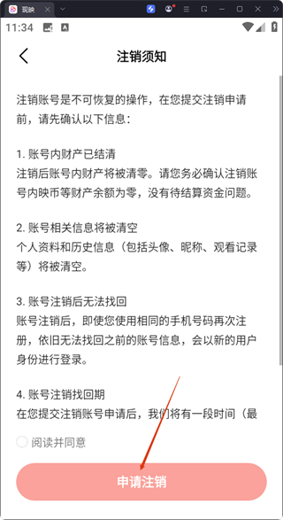 4进入注销相关的提示页面后,仔细阅读各项说明并确认同意相关条款,接着点击对应的注销申请按钮,就能正式提交账号的注销请求。