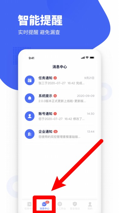 4. 点击消息中心,可查看最新任务、系统提示、账号变更以及企业通知等信息。