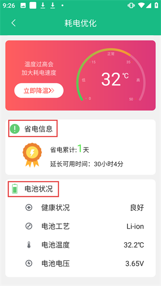 4进入耗电优化相关界面后,能查看省电信息与电池状况板块,从中可获取省电累计时长、电池健康程度等具体内容。