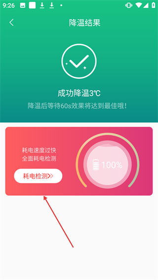 3、降温结束后,要是出现【耗电速度过快全面耗电检测】的提示,可点击【耗电检测】按钮来开展耗电检测。