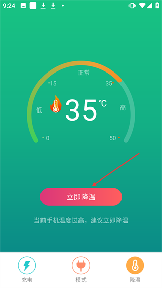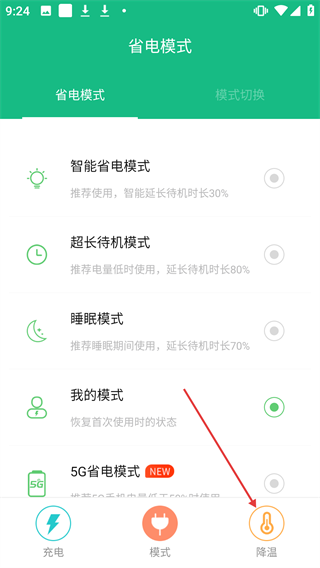 1、在【省电模式】界面点击右下角的【降温】图标,即可进入手机降温功能页面。