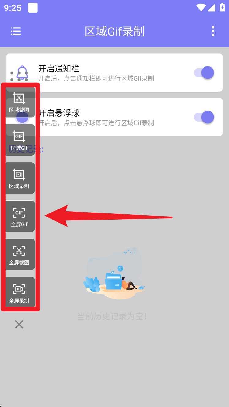 2. 返回主界面后,可以通过点击左侧的功能栏来选择不同的录制方式,如“区域GIF”或“区域录制”。