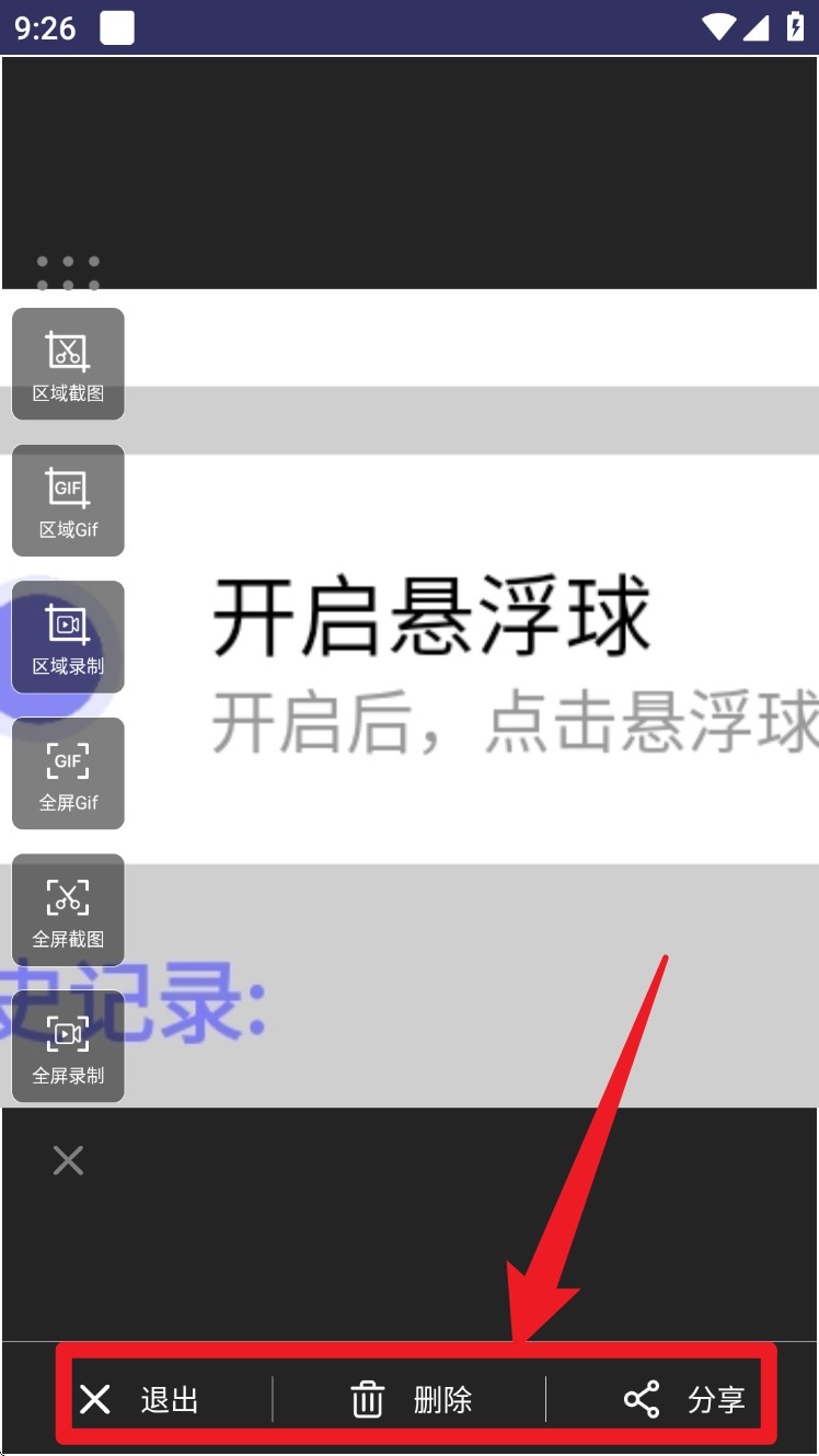 4. 录制完成后,可通过底部菜单栏选择“退出”、“删除”或“一键分享”。
