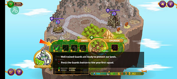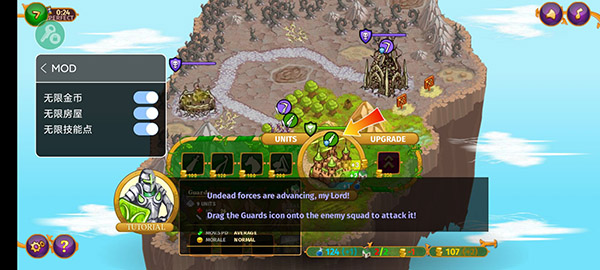 3、过关后能对各种兵种进行升级。点击基地或兵营,然后点击UPGRADE能进行升级。点击左下角的箭头能加速进行游戏;