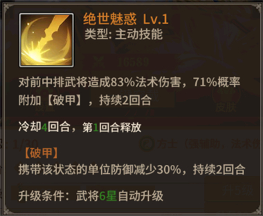 (3)破山剑:张角专属,剑光如月。对随机3名敌将造成伤害, 一定概率降低目标攻击2回合。