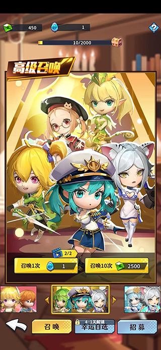当成功通关1 - 10关卡后,酒馆将会解锁。在酒馆里,您只需选择对应的召唤池,就能招募那些慕名而来的英雄们。特别值得一提的是,首次进行单抽,必定能获取一名SSR英雄!而当团长大人成功通关3 - 20关卡后,还会额外获得一张幸运自选券。不仅如此,您还能享受任意30次十连抽的机会,直到抽到令您满意的英雄为止。整个召唤池总共分为“高级召唤”、“种族召唤”以及“友情召唤”这三种类型。