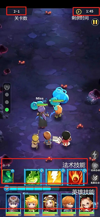 每名英雄都拥有一个主动释放的技能,需要充能条满格才能释放该技能。技能效果受英雄职业影响,具备进攻、防御或是治疗等多种形式。