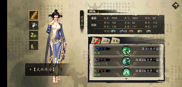 单体伤害高,面板伤害7000多,缺点攻击范围小,可以使用(提升方式:杭州武馆让崔阑和陆长平打一架)