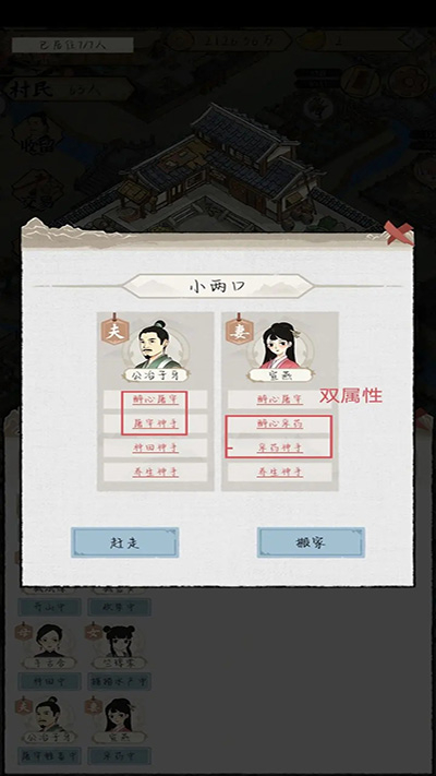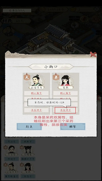 我试着把全部单身汉都聚集到一个屋子里,却发现他们彼此看不顺眼。要是屋子里有夫妻,再添加两三个单身汉,配对相对就比较容易成功。在开展配对时,最好能确保至少有一个村民拥有种田/采药的双属性,因为婚后有较小概率刷出第三个相同属性(我从来没刷出过捕捞和屠宰的第三属性,不确定是否存在)。对于有做工属性的村民,像砍柴 + 种田这种组合,即便婚后刷出种田 buff ,也不能算三属性,所以尽量别让两个做工的村民配对,意义不大。至于做工 + 农活双属性,婚后又刷出相同农活属性的情形,我还没遇到过。