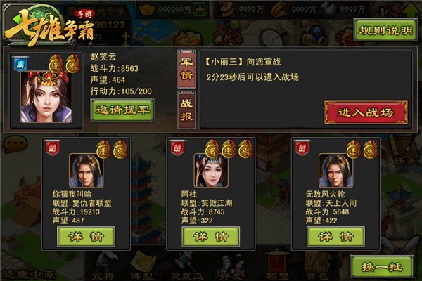 3、玩家可以在全服地图的城池上自由排兵布阵,对城池进行移动或攻击