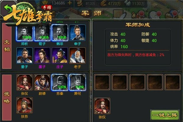 3、武略军师则可以对指定阵型的敌人产生克制的作用,有勇有谋地全方位配合玩家称雄争霸