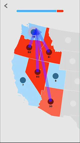 5、你还能同时从多个地块派遣单位进行攻击与扩张。具体操作方法是:先点击并拖动我方的圆点,让它连接到另一个我方圆点,然后再把它拖动到敌方地块,这样就能成功占领敌方地块。