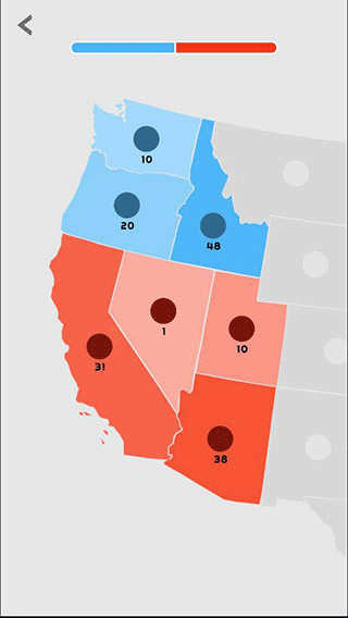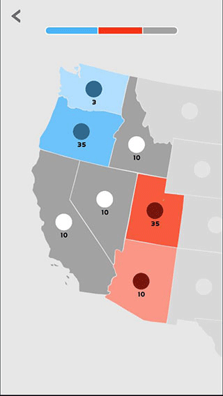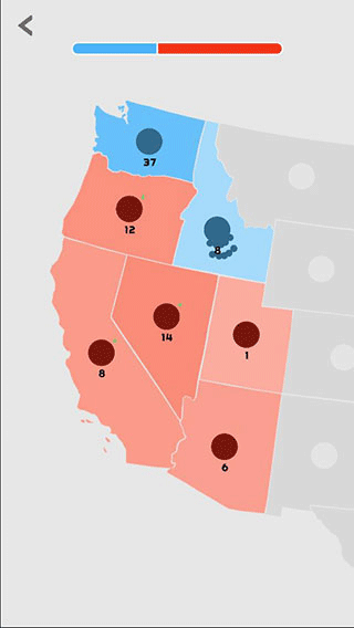3、点击地图块中间的圆点并进行拖动,这一操作意味着派遣单位展开攻击并实施扩张。圆点旁边的数字表示单位数量,此数量会随着时间自动增多,单位数量越多,地图块的颜色也就越深。