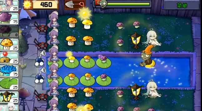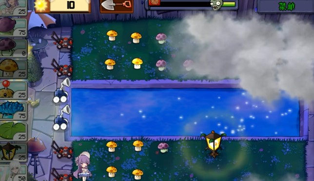 4、然后种植蘑菇不断收集阳谷,布置植物娘位置,消灭僵尸;