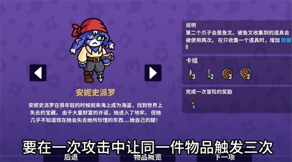 2、人物说明:第二个爪子将是鱼叉。通过鱼叉收集到的道具会被使用两次。当仅收集一个道具时,防御力增加5点。