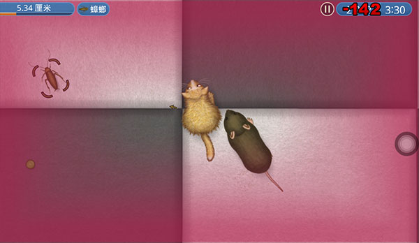 4、轻轻触碰屏幕,猫咪就会移动到相应位置,吃掉比它小的东西,比如蟑螂、豌豆。