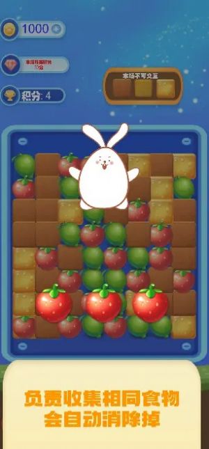 1、基本消除规则:游戏玩法简单易懂,只需将三个及以上相同颜色或造型的兔子连成一线,即可实现消除。消除后兔子上方的物品会掉落填补空位,从而产生新的消除机会。