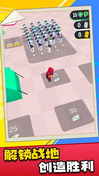 这是一款策略游戏,能升级兵营,实现无限爆兵。玩家可借由战争获取海量金币,用于升级兵营与提升士兵等级。打败敌方军团,持续拓展领土,建造更多兵营,加速士兵训练进程。快来带领你的部队,直捣敌方大本营,开拓疆土吧!
