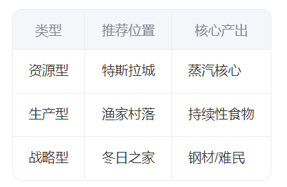 基础生存科技:从锯木厂开始,依次发展到加热器、温室、灯塔、蒸汽枢纽、采煤机、钢厂,直至冰墙钻机。这条发展路径能够保障木材、食物、钢材等基础资源的稳定供应。