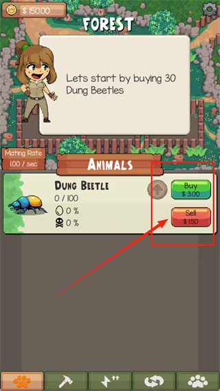 1. 轻点绿色的“BUY”按钮,购入30只屎壳郎,就此开启你的动物园经营征程。