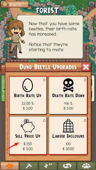 2、购买甲虫后,会出现升级面板,你可以花钱提升它们的繁殖率,让动物园更快地发展。