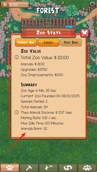 3、点击“ZOO STATS”查看动物园的数据,了解目前的经营状况,比如动物数量、收入等。