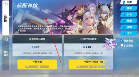 1、安装后,打开应用,直接点击“标配”选项,你就能够选择女武神卡池进行十连补给或单次抽卡。