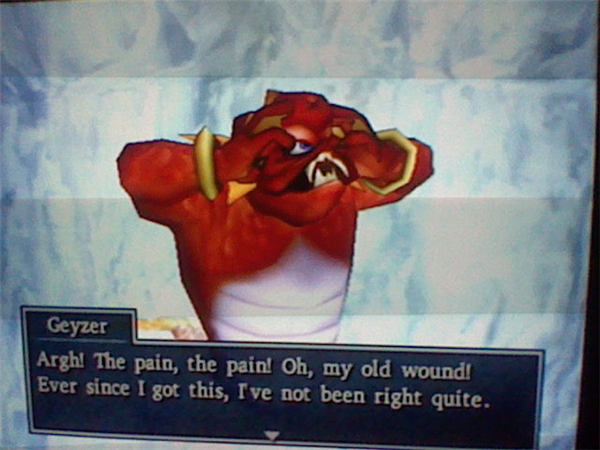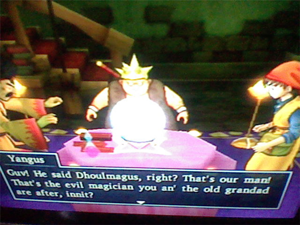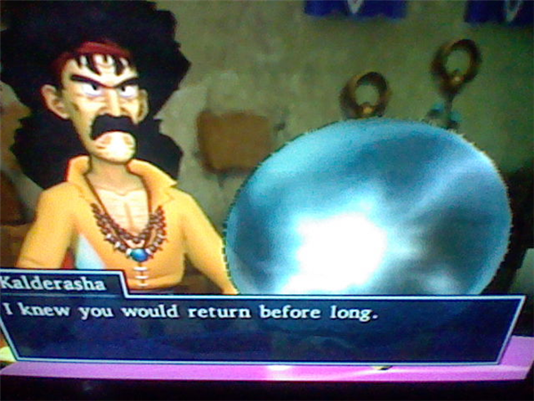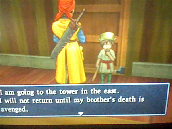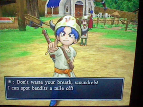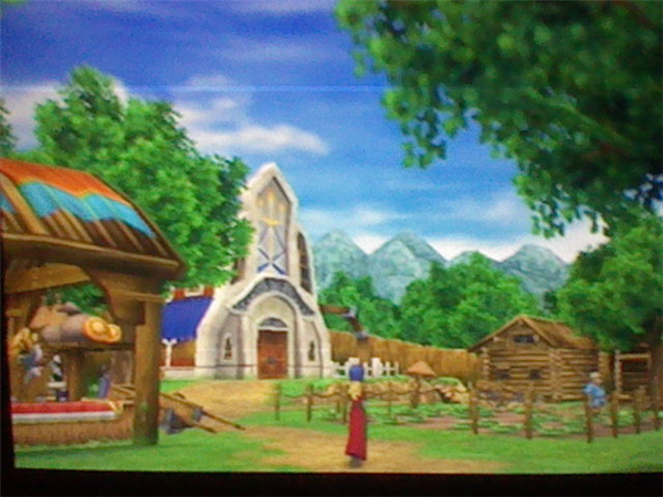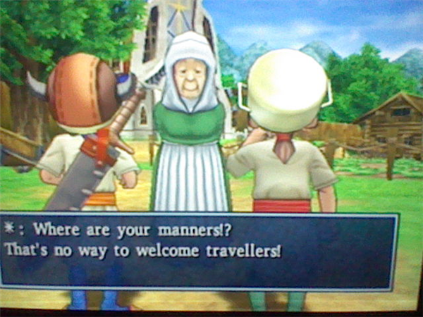 很显然,这群奇怪的人来到个陌生的村落,注定会招来异样的眼光,果然,大家对变成那美克星人的国王表示鸭梨很大,赶快躲到旅店吧,休息之前,打听到了这个村子有个法师,他能找到诅咒国王和公主的 元凶,第二天,通过村人的打听,发现那位法师已经去世了,在大家正灰心丧气的时候,在酒吧偶然听到了法师的消息,马上上去问问,正开口,门外冲进来一个村民,说魔物进攻了村子,马上赶出去看看。