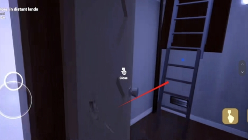 2、进入之后,玩家会出现在房间外部,许多房间都上了锁,玩家可以找找未锁的房间。进入房间,会发觉房间正在摇晃,黄衣宝宝也消失了。此时,我们先前往二楼,从下图所示位置上去。