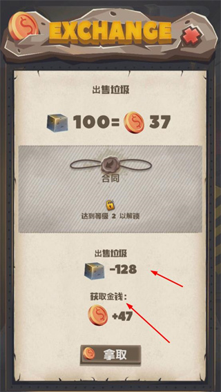 3、进入EXCHANGE界面,在这里能够通过出售垃圾来获取金钱,垃圾数量不同,所对应的金钱收益也不一样。点击“拿取”选项,即可领取出售垃圾所得的金钱。