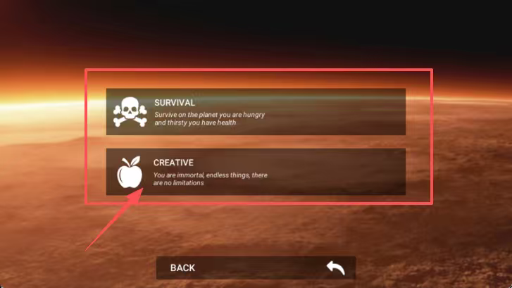 2、画面中间偏上位置有一个红色边框的选单,上面显示着SURVIVAL和CREATIVE这两个模式。若想挑战生存模式,就点击SURVIVAL;若想选择创造模式,就点击CREATIVE。