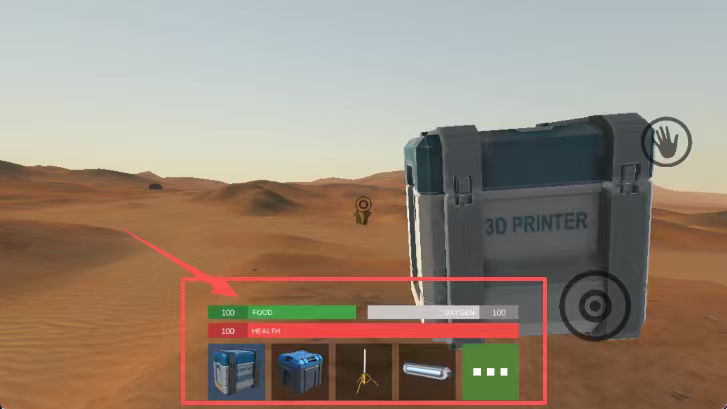 3、在沙漠场景中,右侧有一个标着“3D PRINTER”的灰色箱子,左下角的红框里显示着食物100、健康100等数值,只要直接查看这个区域,就能知晓当前的生存状态。