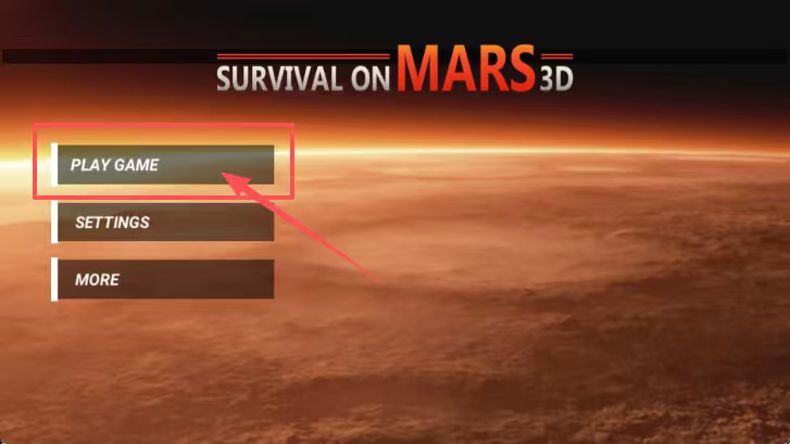 1. 打开游戏,映入眼帘的是橙红色的火星地表背景,画面中间设有三个按钮,其中白色的“PLAY GAME”按钮被红框高亮标注,点击此按钮即可开启游戏。