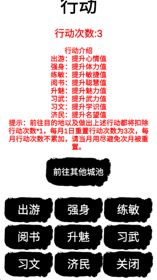 10、通过行动,角色能够提升对应的属性值,从而变得更为强大,在乱世之中拥有自保的能力。