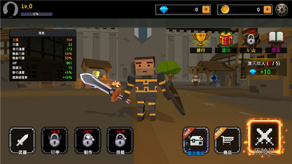 1. 升级次序 优先用金币升级,最高能升到十级,但金币常常不够用,所以 +50%金币的加成相当关键。接着是材料,进化武器需要一些晶块,制造装备同样也需要,而且制造出来的装备提升效果颇为显著。钻石相对来说没那么重要,我抽了大概20次,仅有5把三星武器……四星及以上的一个都没有。也许是我运气太差?经验方面不用特意去升,玩上几个小时基本就能满级了。