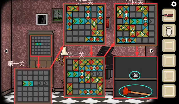 从钢琴视角来看:点击柜子上方的格子游戏,接着需把天蓝双格长条朝右移动至带有标记的地方。